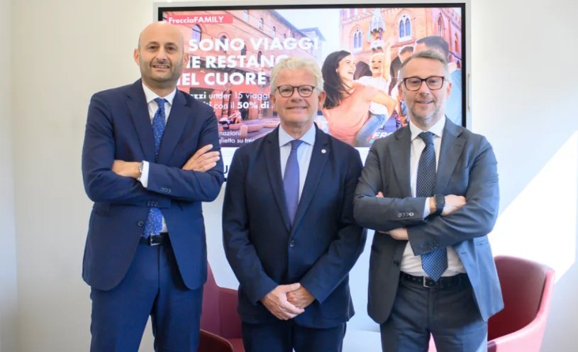 Mario Alovisi, Chief Marketing and Revenue Management Officer at Trenitalia and CEO of Italia Loyalty (right), Patrick de Roux, CEO of SkyTeam (centre) and Gianpiero Strisciuglio, CEO and General Manager of Trenitalia (left), during discussions on new technology-led air–rail integration designed to enhance business travel across Italy.